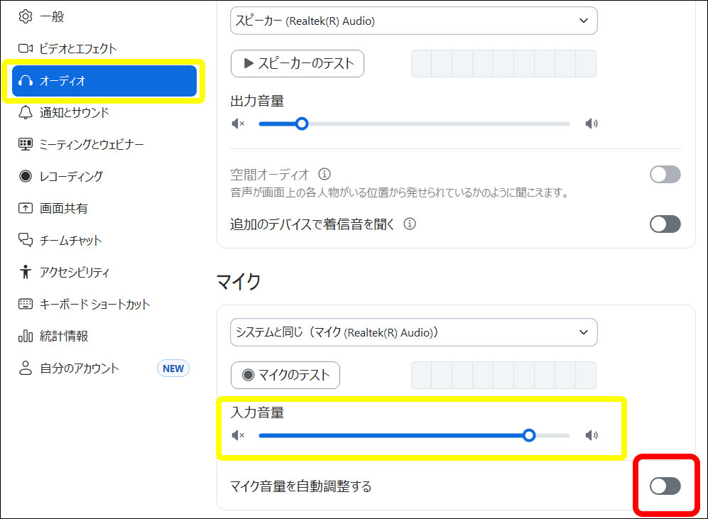 ③オーディオの設定画面が開いたら、下の画像で黄色い枠に囲まれているバーでマイクの入力音量を調整します。赤い枠の箇所をクリックすると、『自動調整』に設定することができます。